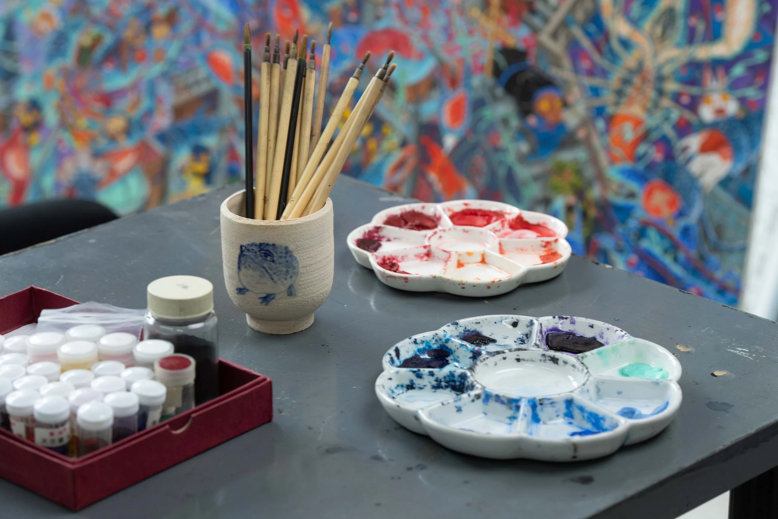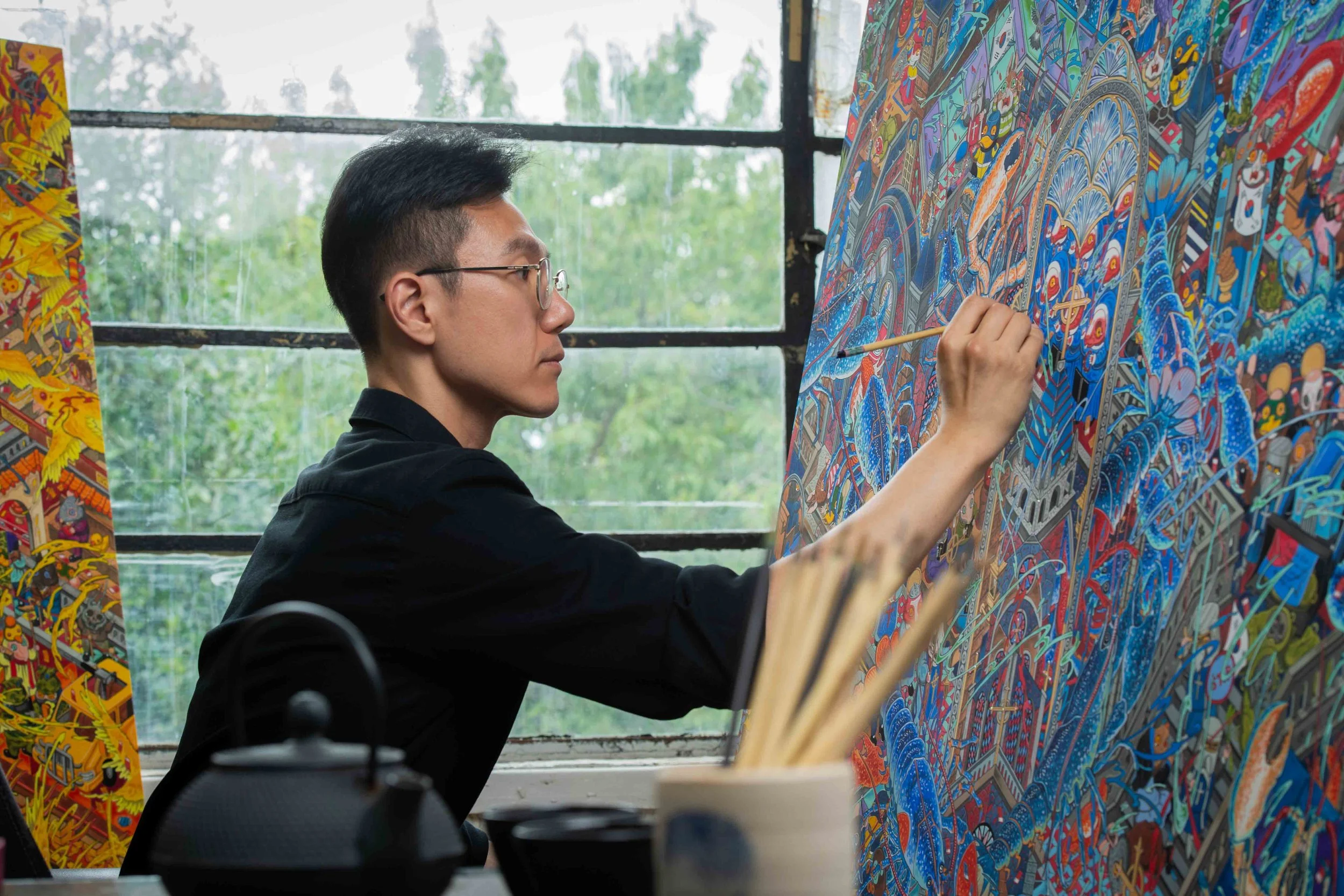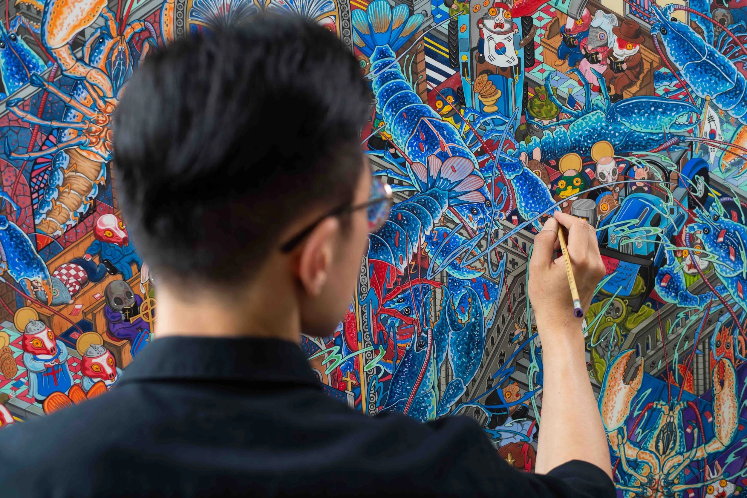 Early on in his artisic journey, whilst still living in Korea Hunkyu trained in the restoration of Eastern Paintings, studying in the College of Fine Art at Seoul National University. Then when he moved to the UK, inspired by the freedom and diversity that he experienced in Europe, he developed his own very distinctive painting style, using the traditional techniques he’d learn and used to restore great buddhist paintings with contemporary art of western culture. That led to his being noticed even before he finished his MA at The Royal College of Art, and getting gallery representation as soon as he graduated, and then exhibiting at the The Frieze Art fair just a few months later.