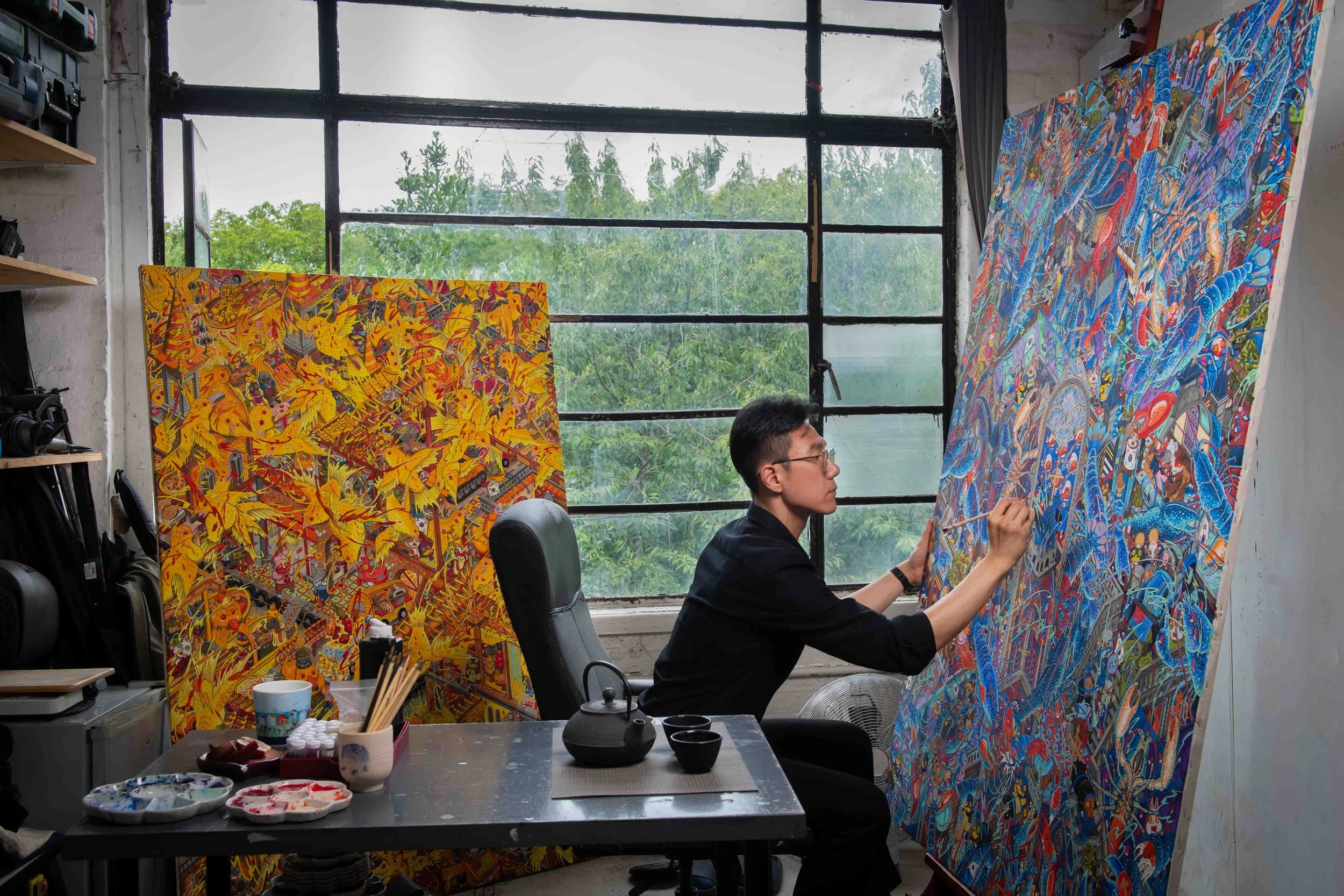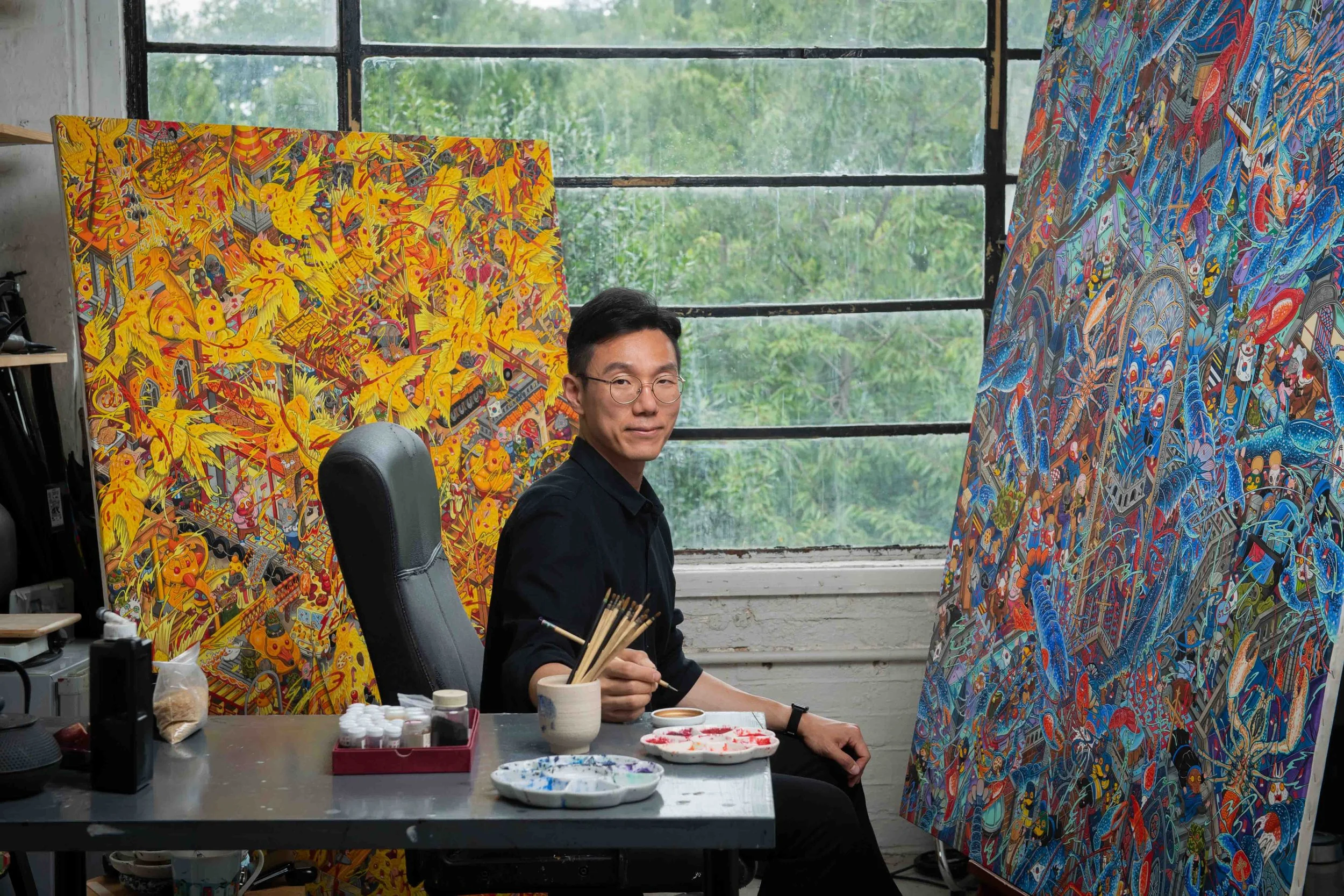 When I met Korean Artist Hunkyu Kim he was sat in his studio in East London, surrounded by the most incredible, meticulously painted and vibrant coloured canvases, as he put the finishing touches to several paintings, for his upcoming exhibition at the Perrotin Gallery in Seoul, South Korea.
